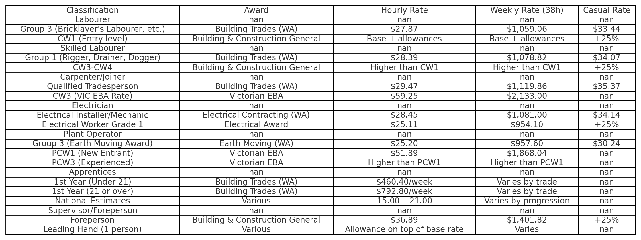 Below is a comprehensive breakdown of minimum pay rates for key construction roles as of early 2025. Note that these rates represent minimum entitlements under the relevant awards – many workers receive higher pay through enterprise bargaining agreements or over-award arrangements.