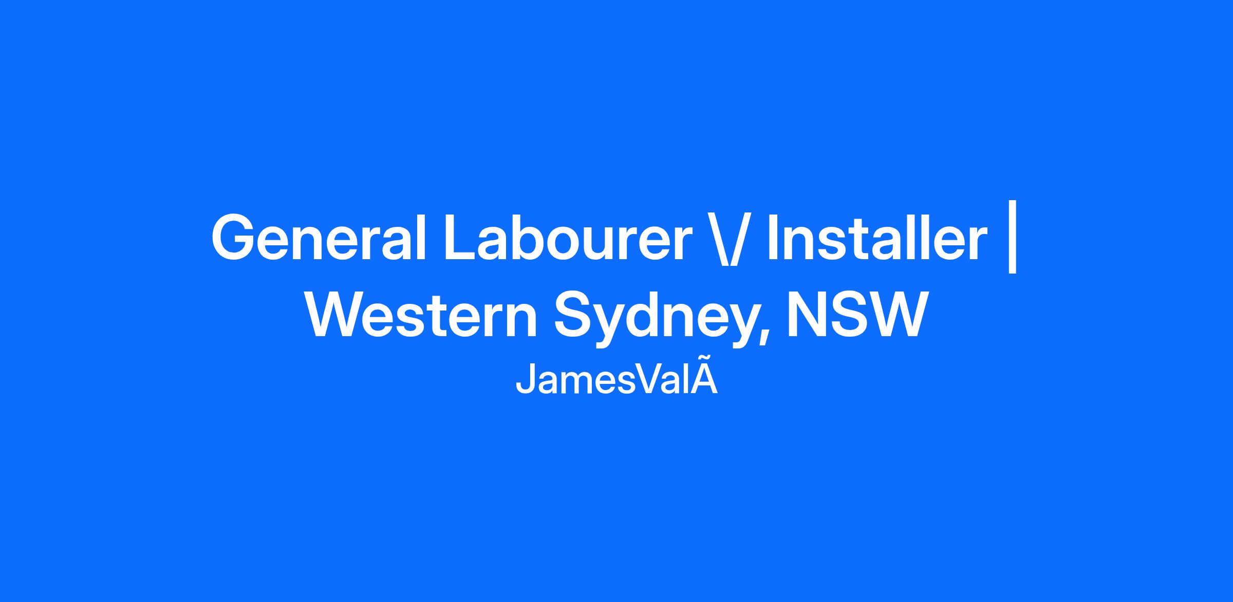 <\/html>"}}],"isMobile":false,"iframe":"true","jobType":"Full time","applyName":"Apply Now","zsoid":"679383027","FontFamily":"PuviRegular","jobOtherDetails":[{"fieldLabel":"Industry","uitype":2,"value":"Trade and Services"},{"fieldLabel":"Salary","uitype":1,"value":"Competitive remuneration package"},{"fieldLabel":"City","uitype":1,"value":"Silverwater"},{"fieldLabel":"State\/Province","uitype":1,"value":"New South Wales"},{"fieldLabel":"Zip\/Postal Code","uitype":1,"value":"2128"}],"headerName":"General Labourer \/ Installer | Western Sydney, NSW","widgetId":"504809000000072311","isJobBoard":"false","userId":"504809000000225003","attachArr":[],"customTemplate":"3","isCandidateLoginEnabled":true,"jobId":"504809000025243023","FontSize":"15","location":"Silverwater","embedsource":"CareerSite","indeedCallBackUrl":"https:\/\/recruit.zoho.com\/recruit\/JBApplyAuth.do","logoId":"b849yfc99793bd32a43a9ab1a6c3af7618ce6"}