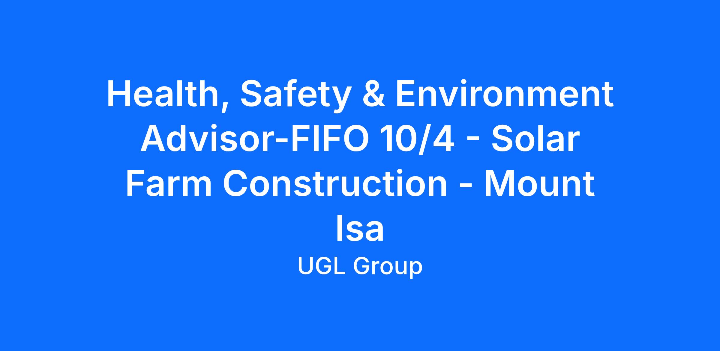 Health, Safety & Environment Advisor-FIFO 10/4 - Solar Farm Construction - Mount Isa