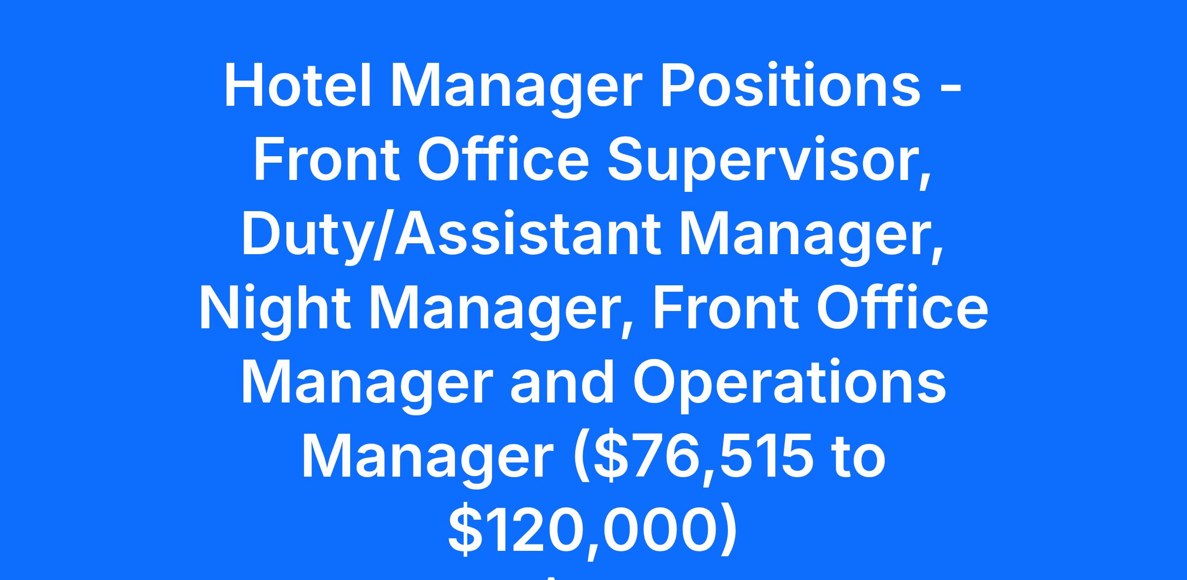 Role: Hotel Manager Positions - Front Office Supervisor, Duty/Assistant Manager, Night Manager, Front Office Manager and Operations Manager