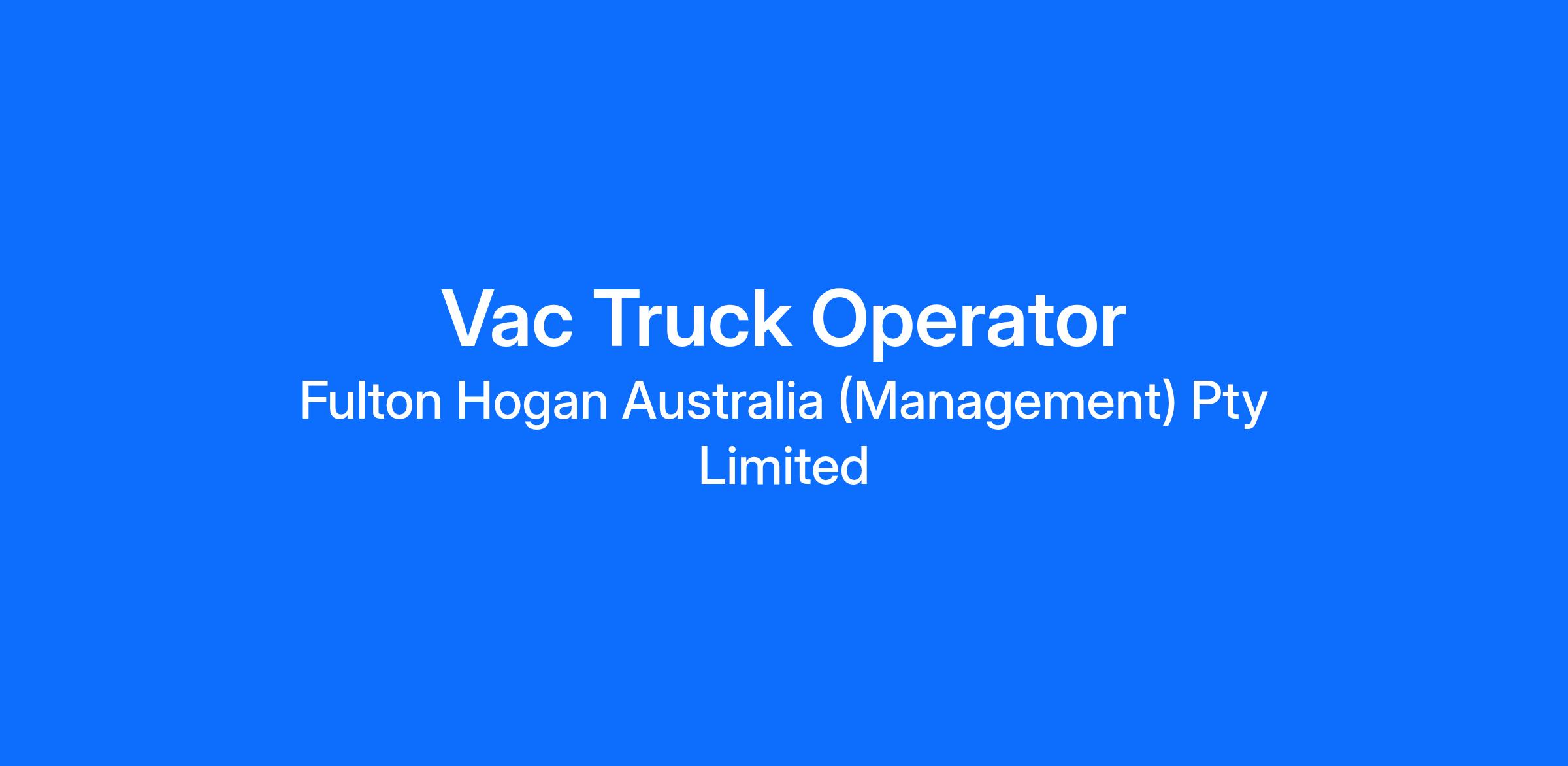 We wish to complement our existing team with an experienced Vac Truck Operator for our Water/Civil Projects within our Fulton Hogan Utilities business. This is a fantastic opportunity for you to drive your career further, and gain industry relevant experience, with on-the-job skill development/coaching offered throughout. We offer excellent employee benefits and pathways for further growth.