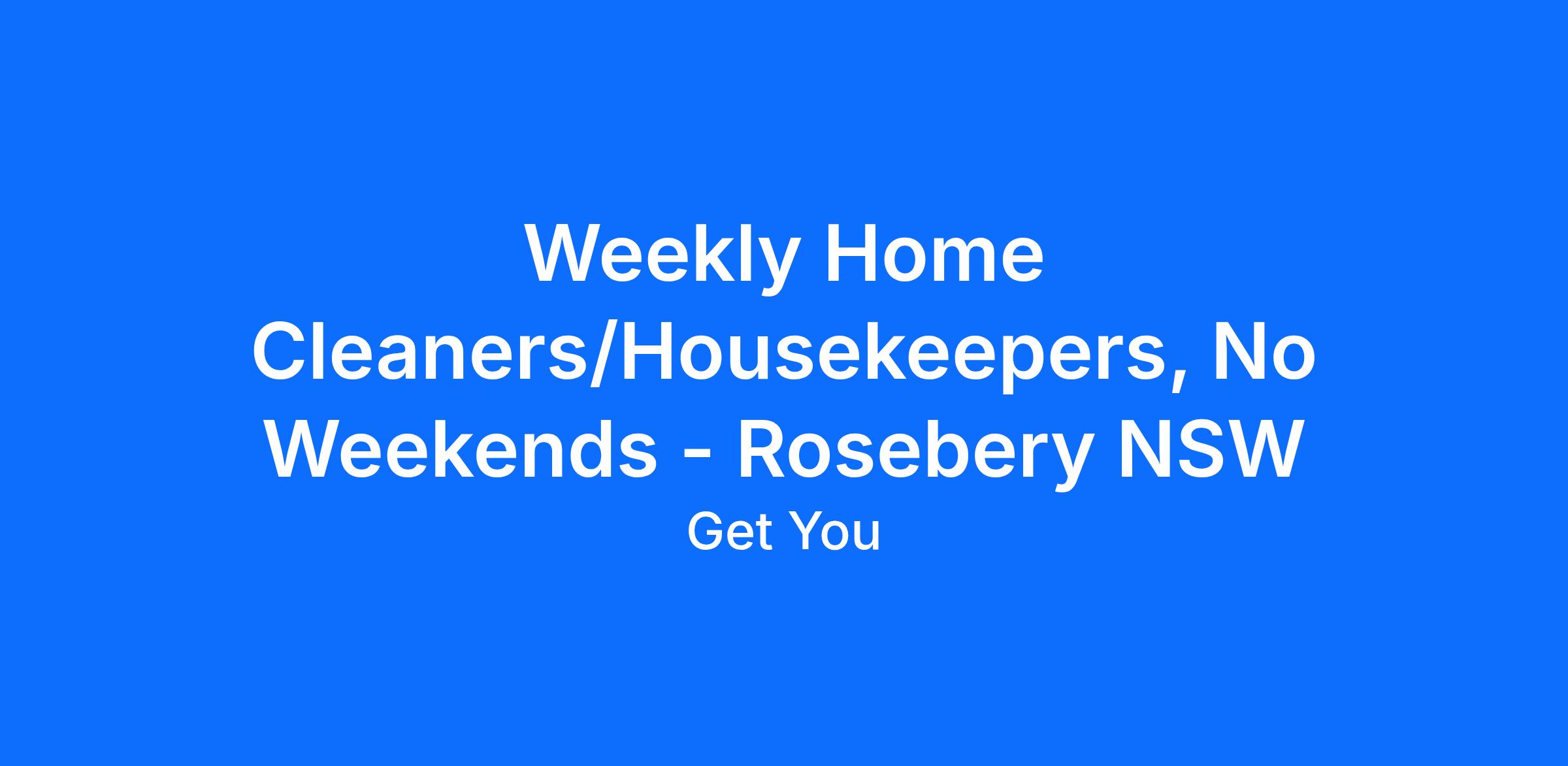 Housekeepers / Cleaners, Rosebery NSW<\/b> Join Get You Housekeeping<\/b>, a trusted company with 14 years of experience providing professional housekeeping services across Sydney and Brisbane. We specialise in regular weekly housekeeping for private homes, not one -off or commercial cleaning. If you live in or can travel to Rosebery or nearby suburbs such as Mascot, Alexandria, Zetland, Redfern, Eastlakes, or surrounding areas, we would love to hear from you. What We Offer<\/b> $32.25 to $45.50 per hour, paid weekly on Tuesdays Ongoing weekly shifts with the same clients Weekday work only, no weekends or late nights Minimum 3 to 4 hour shifts Cleaning products and supplies provided by clients Paid in -person training before you start Supportive and professional management team Promotion opportunities for reliable and consistent workers Your Role<\/b> Clean kitchens, bathrooms, floors, and living areas Make and change beds Laundry duties including folding and ironing General tidying and light household organising Experience in housekeeping or residential cleaning Living in Rosebery or happy to travel locally Availability any day from Monday to Friday between 8 am and 6 pm Conversational English Already in Australia with valid work rights Working Holiday Visa applicants must have solid cleaning experience and commit to a minimum of six months Why Work With Us<\/b> We are not a gig app or short -term agency. We offer steady, long -term roles with regular clients. We assign homes close to where you live to reduce travel time. How to Apply<\/b> Apply through this job ad or email your resume to: